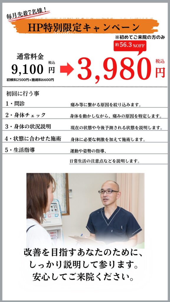 当院が初めての方に限り、初回のみ3,980円になります。問診時にホームページを見たとお声掛けください。